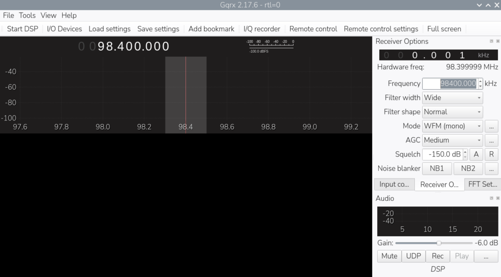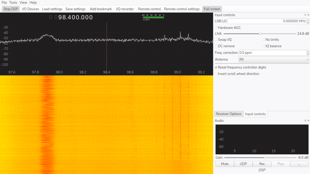 You’ll see nothing is happening; no wavy lines or waterfall. You will notice that there are number across the bottom of the graph though, and on the left you have some options for tuning your receiver. Click in the first selectable box called Frequency. I’m going to choose 98.4 FM as a place to put in the middle of the display, but it wants it in kilohertz, so that would be 98400.000 kHz. You’ll notice that unlike the Seesii, we can only display 2.4 MHz on the screen at one time, but we do get a nice refresh rate of peaks displaying. If you bought the much more expensive version of the NooElec, then you would see twice that width. Anyway, press Enter and you will see that your red line is over that frequency.