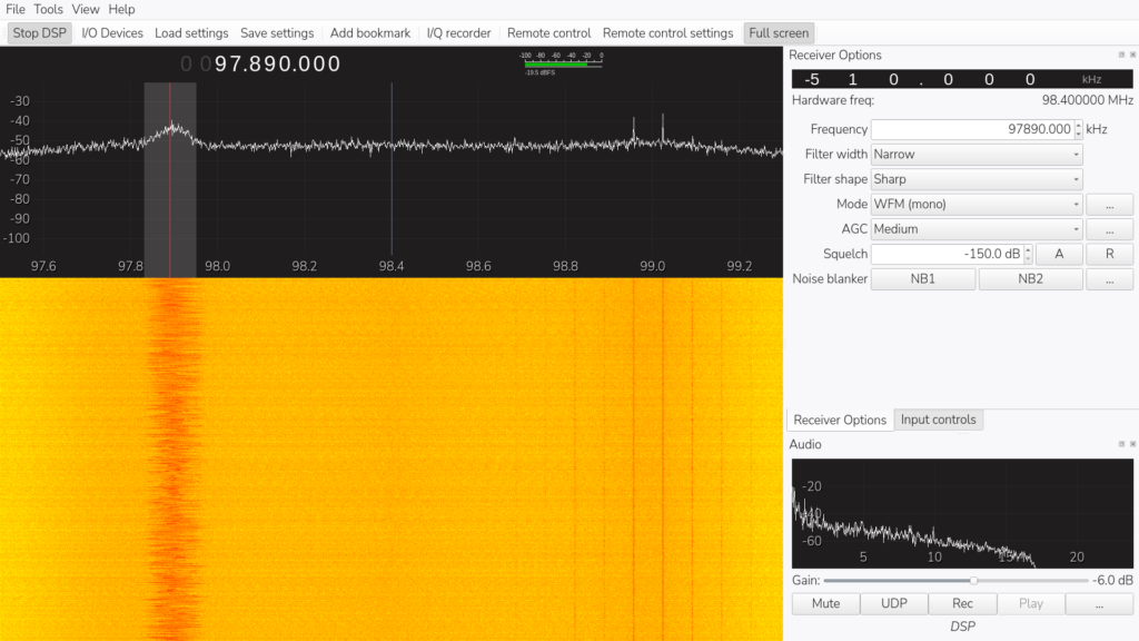 Let’s start this thing. Click on the ‘Start DSP’ (stands for ‘Digital Signal Processing’) button in the top-left hand side. Hopefully, you will see your wavy line on the screen as well as. You will see your waterfall appear too. This is that section of the band being received over time. Depending on your aerial you may have multiple signals. Those signals don’t look huge do they? But which one looks nice a wide? In your window with the wavy line, drag the red line to be where the best peak is.